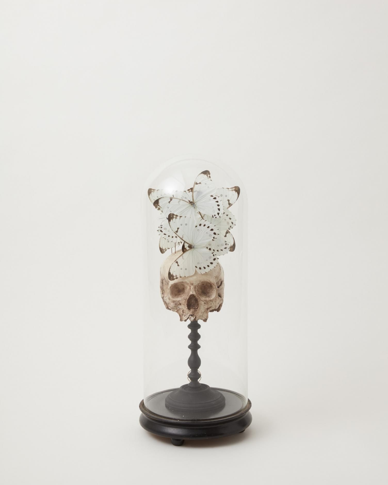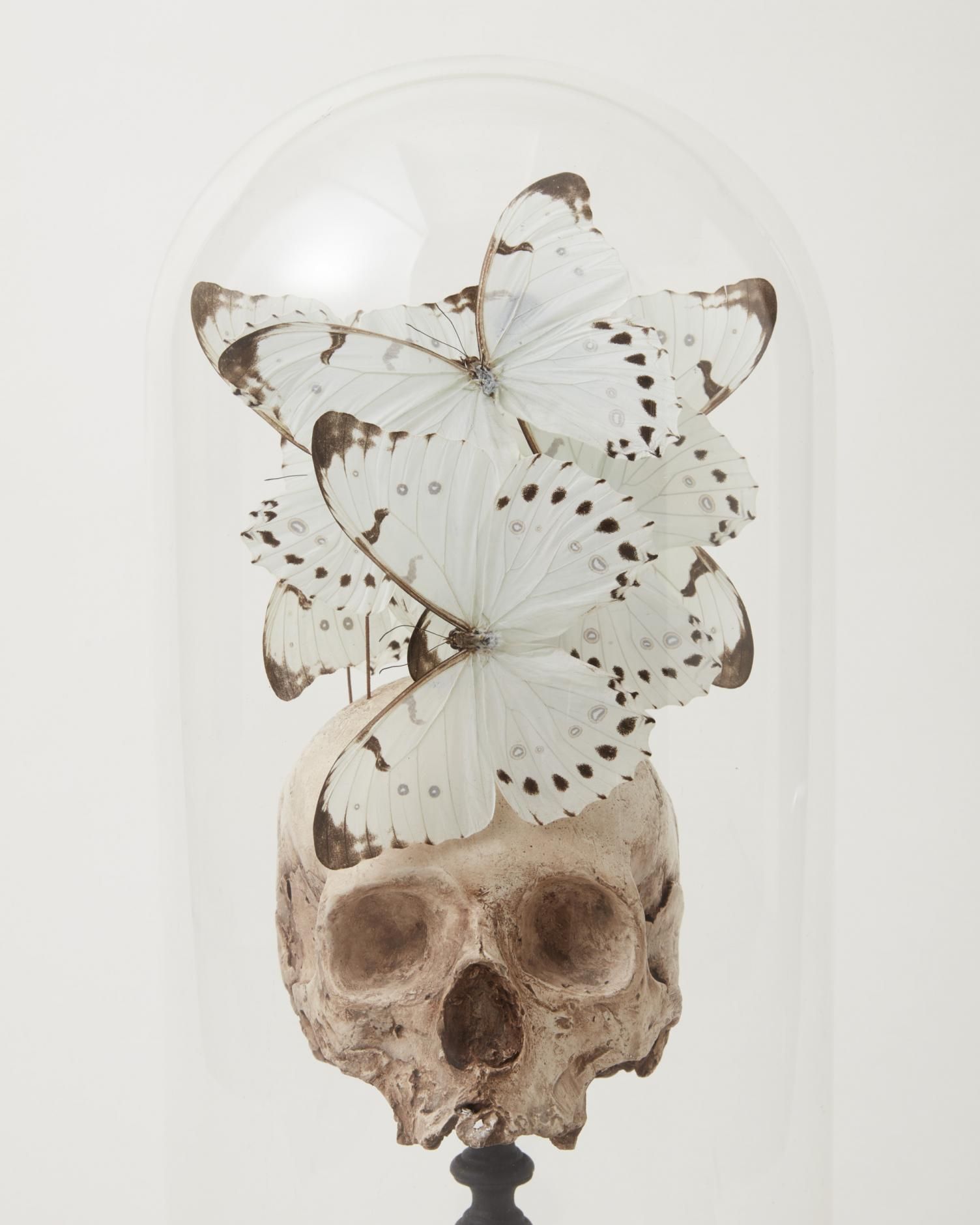頭蓋骨の上に蝶蝶があしらわれた作品。